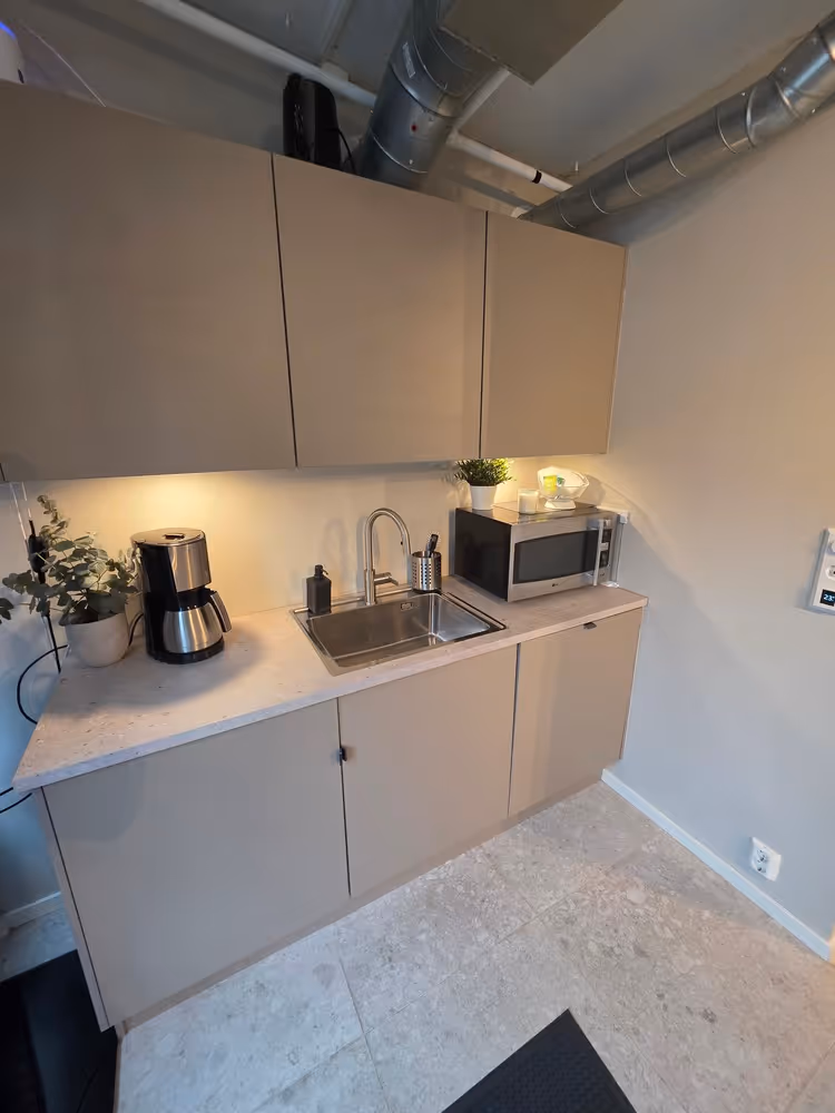 Hos oss finner du alt du trenger for å gjennomføre effektive møter – et fullt utstyrt møterom med moderne presentasjonsteknologi, raskt og stabilt nettverk, samt tilgang til et hyggelig kjøkken. I tillegg kan du slappe av eller ta uformelle samtaler i vårt koselige sofaområde, som gir rom for gode ideer og inspirasjon.